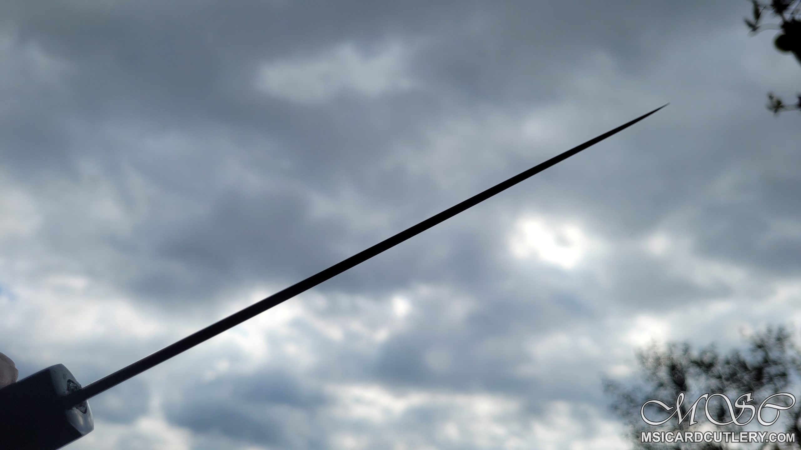 Spine: 3.26mm at the handle, 2.54mm at halfway, .71mm 1cm from the tip
