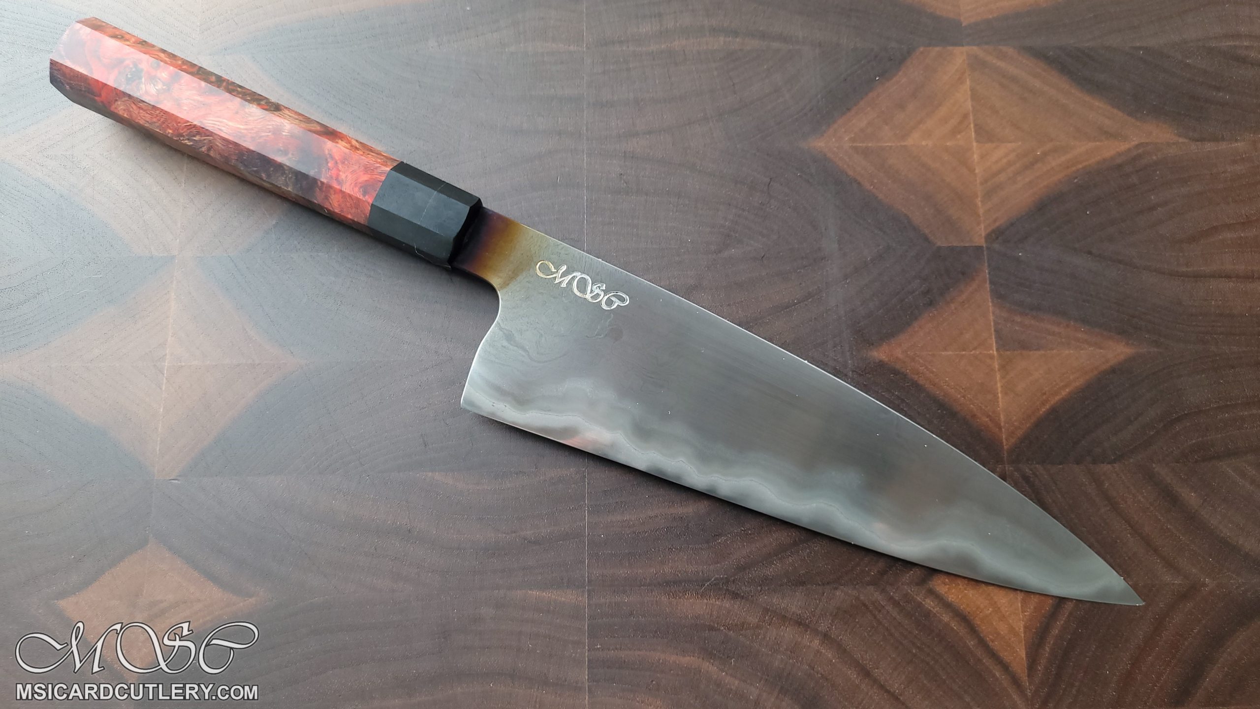 This 190mm ProCut San-Mai Gyuto represents a large step forward in my polishing abilities. In this blade the various hues of carbon diffusion are visible at the weld interface while the cladding itself carries a natural mural of alloy banding patterns that exist within the steel itself.